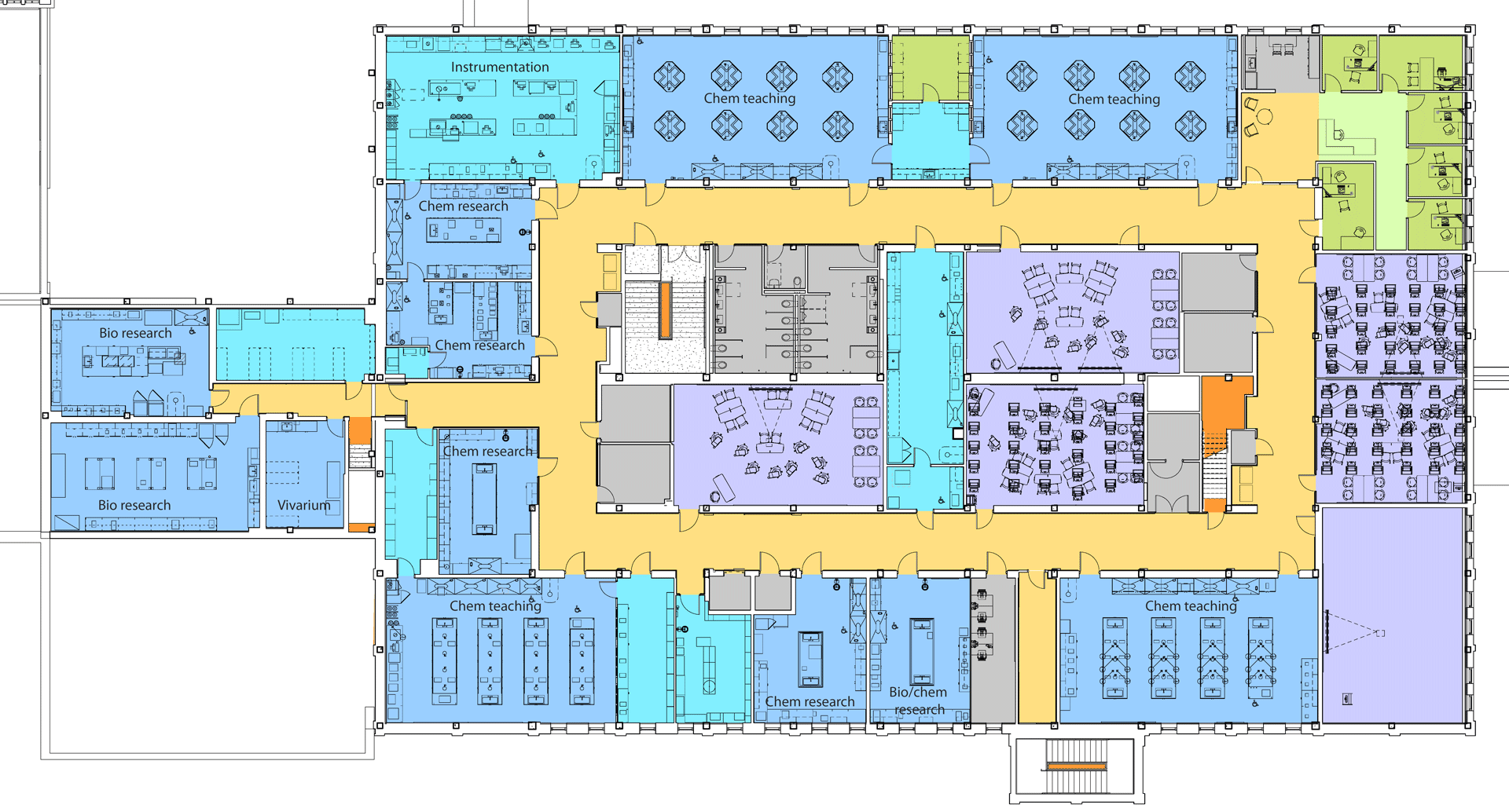 The new addition focuses on greatly needed classroom space, optimized for collaborative project-based learning. An under-utilized tier classroom will be repurposed to form a campus side entry to the building and to create flexible, informal collaborative learning and social areas for students and faculty. Additional specialty spaces include a vivarium, greenhouse and biology museum with a collection of several thousand specimens.